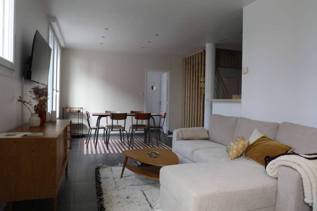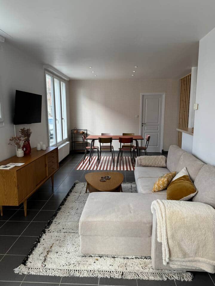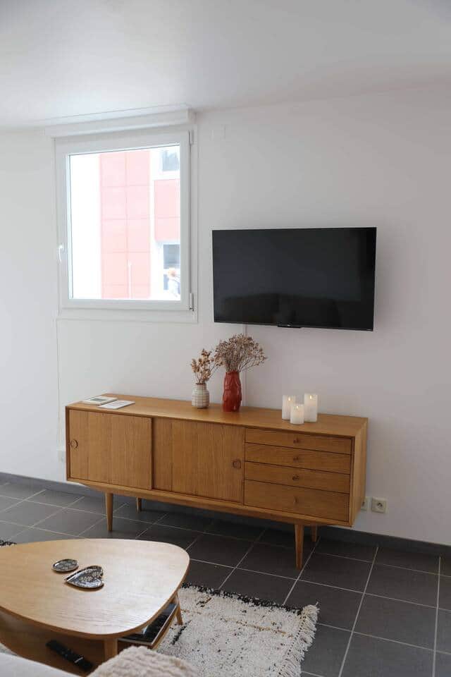 Un salon avec un canapé-lit avec un vrai lit. Tout est fait pour que vous vous y sentiez bien. Vous trouverez au niveau du meuble télé : les verres à vin et les verres à bières pour l'apéro.