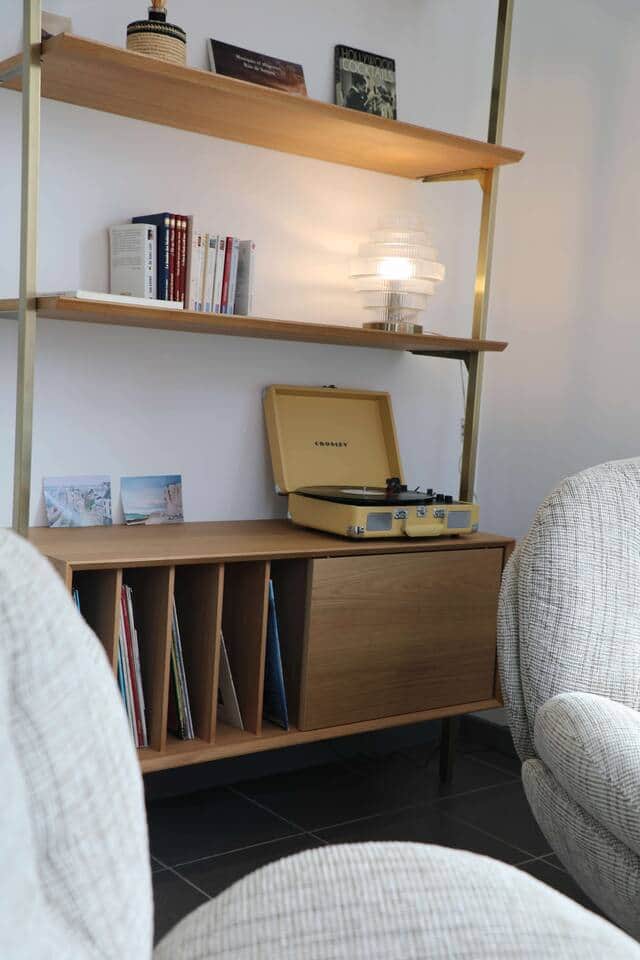 Mon petit coin salon que j'adore, avec des assises très confortables et un coin vinyles avec des romans pour ceux qui le souhaitent : avec des romans de notre région pour bien s'imprégner de la mer et de nos côtes...
